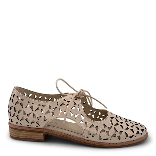 AMRITA is a flat loafer with perforated leather. Features a small heel and front and side cut details.