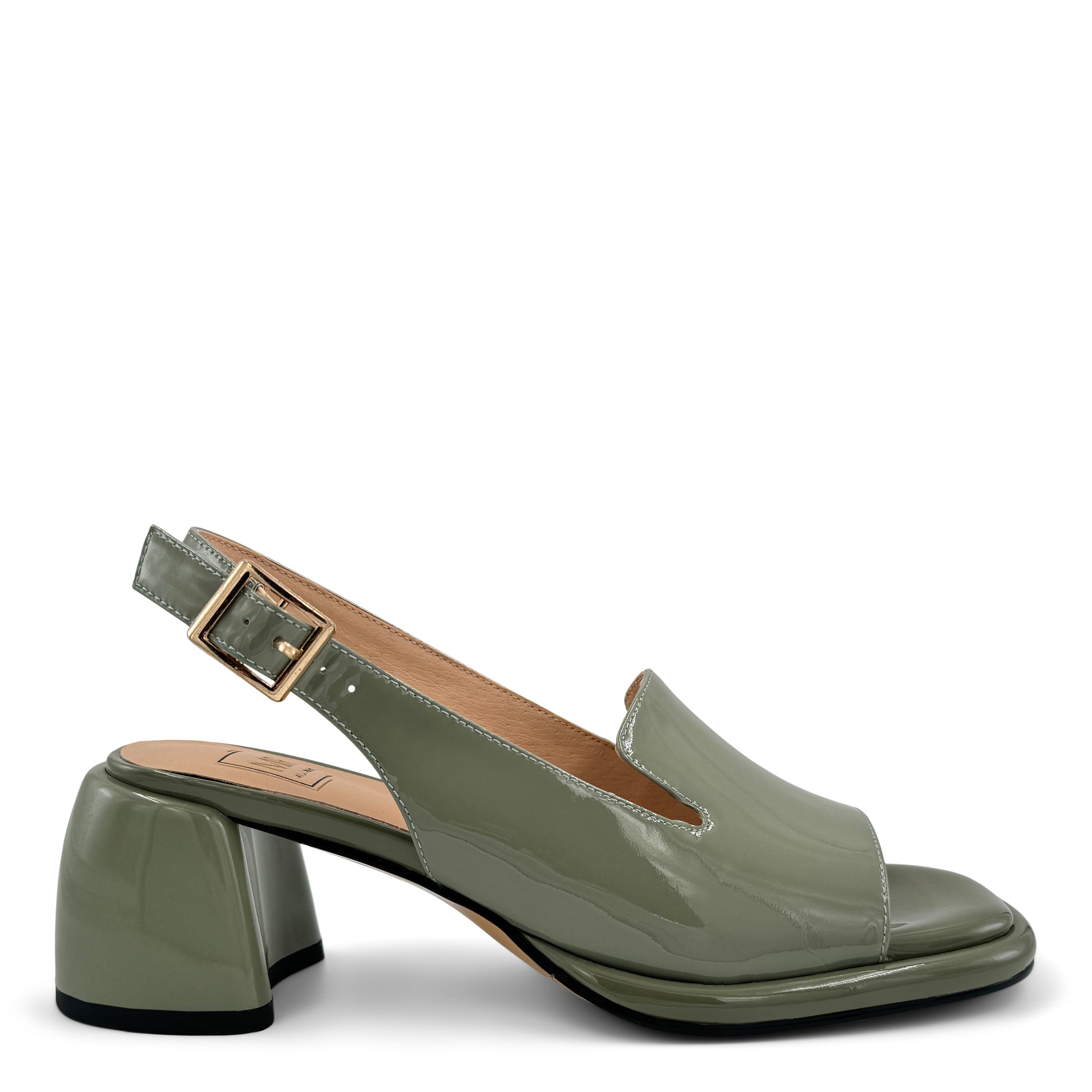 URIDE is a block heel with an adjustable ankle strap and patent finish.