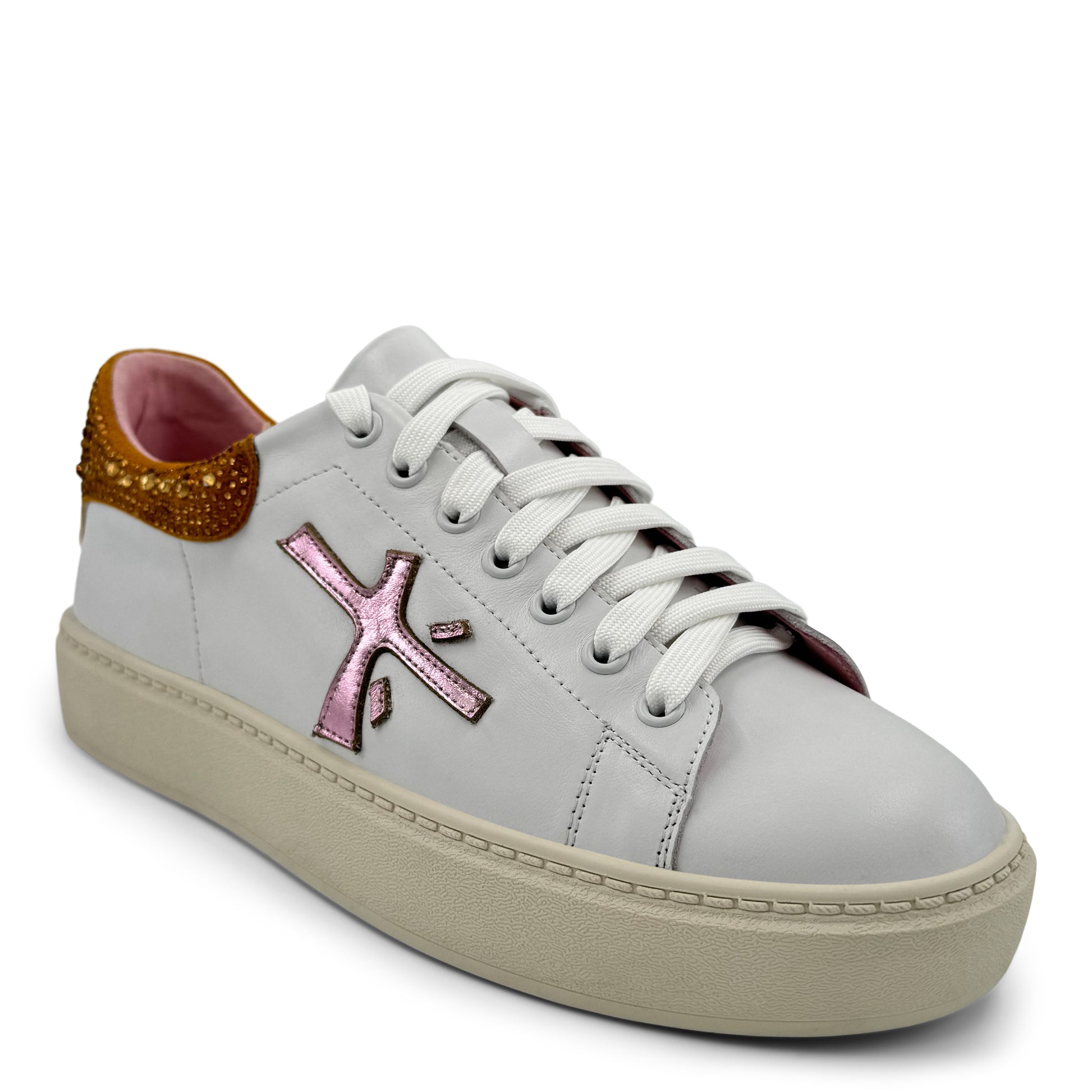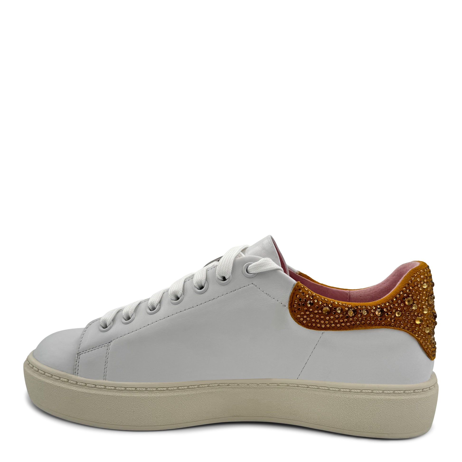 VINCE is a platform lace-up sneaker with a leather finish and bejewelled ankle detail.
